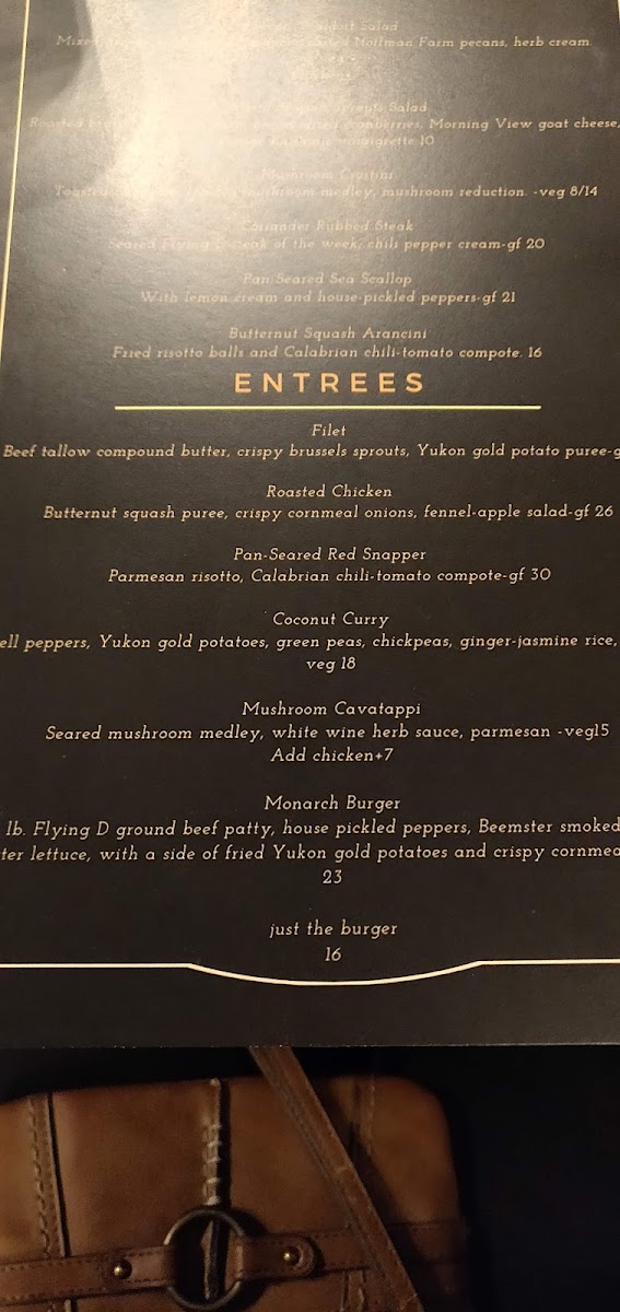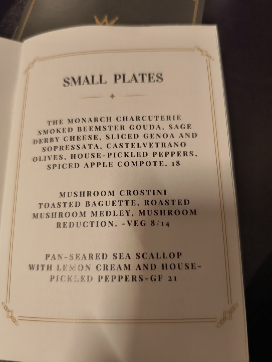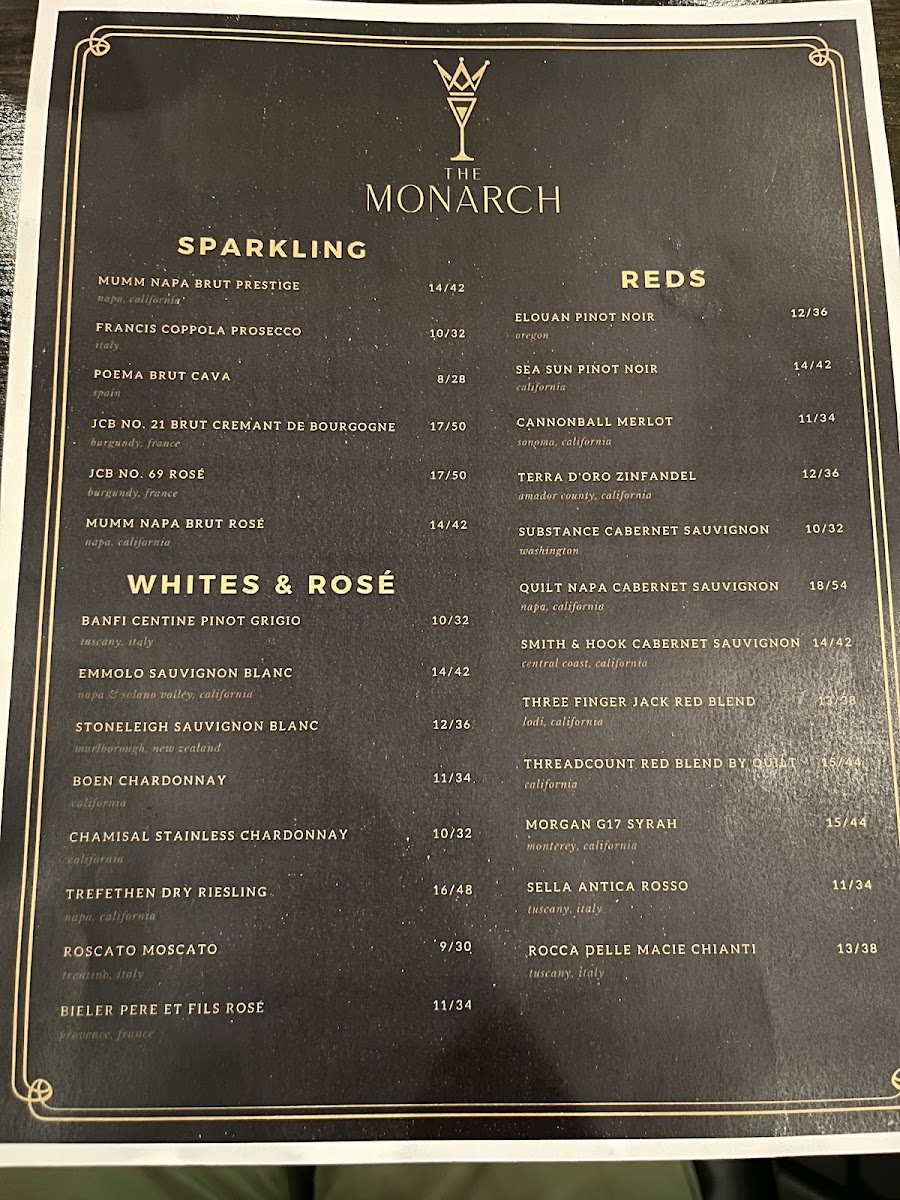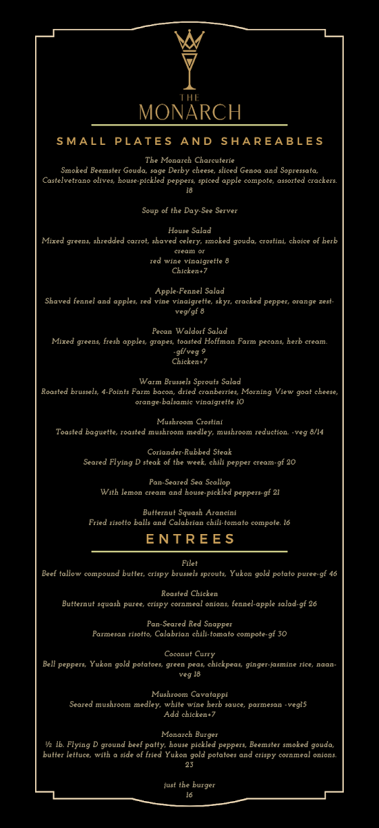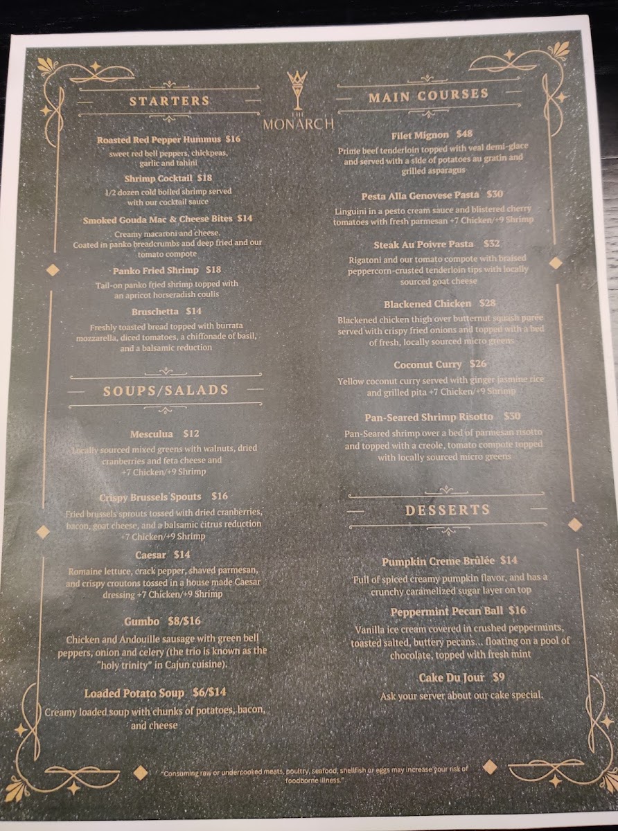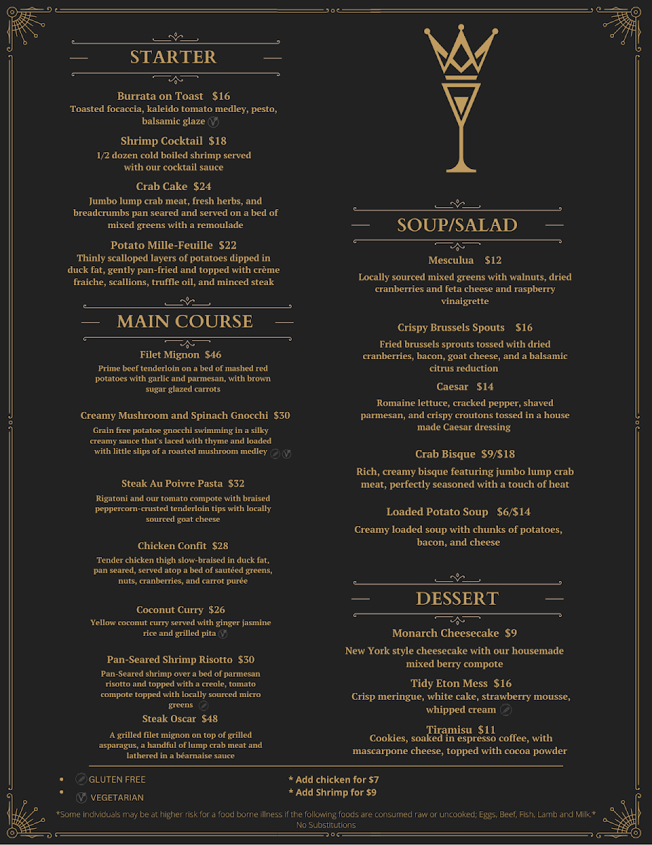 The Monarch offers a thoughtfully curated menu that reflects a refined yet approachable New American style. The selection balances carefully crafted starters, hearty entrees, and elegant desserts, designed to complement the restaurant’s upscale Victorian-inspired atmosphere.